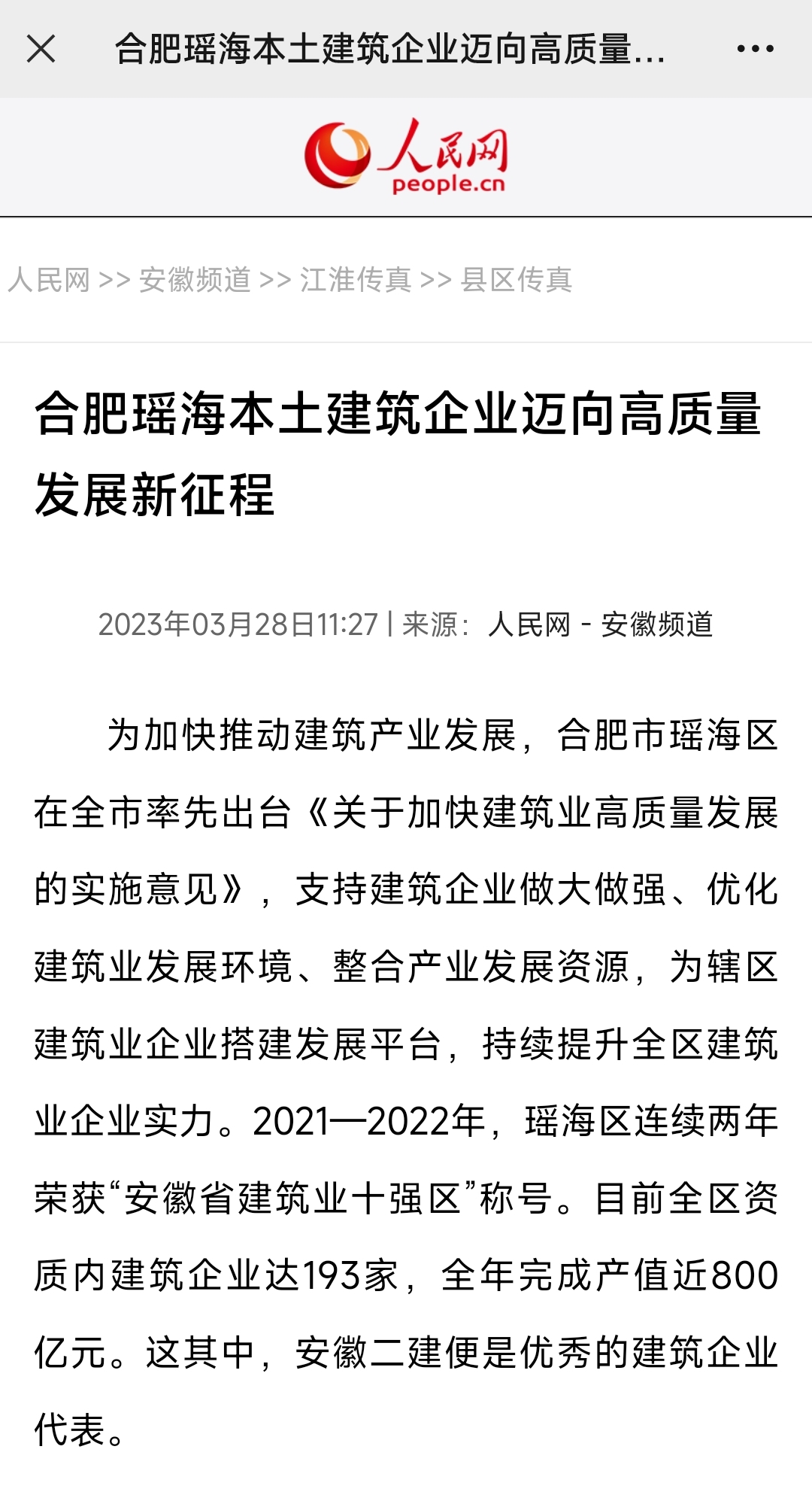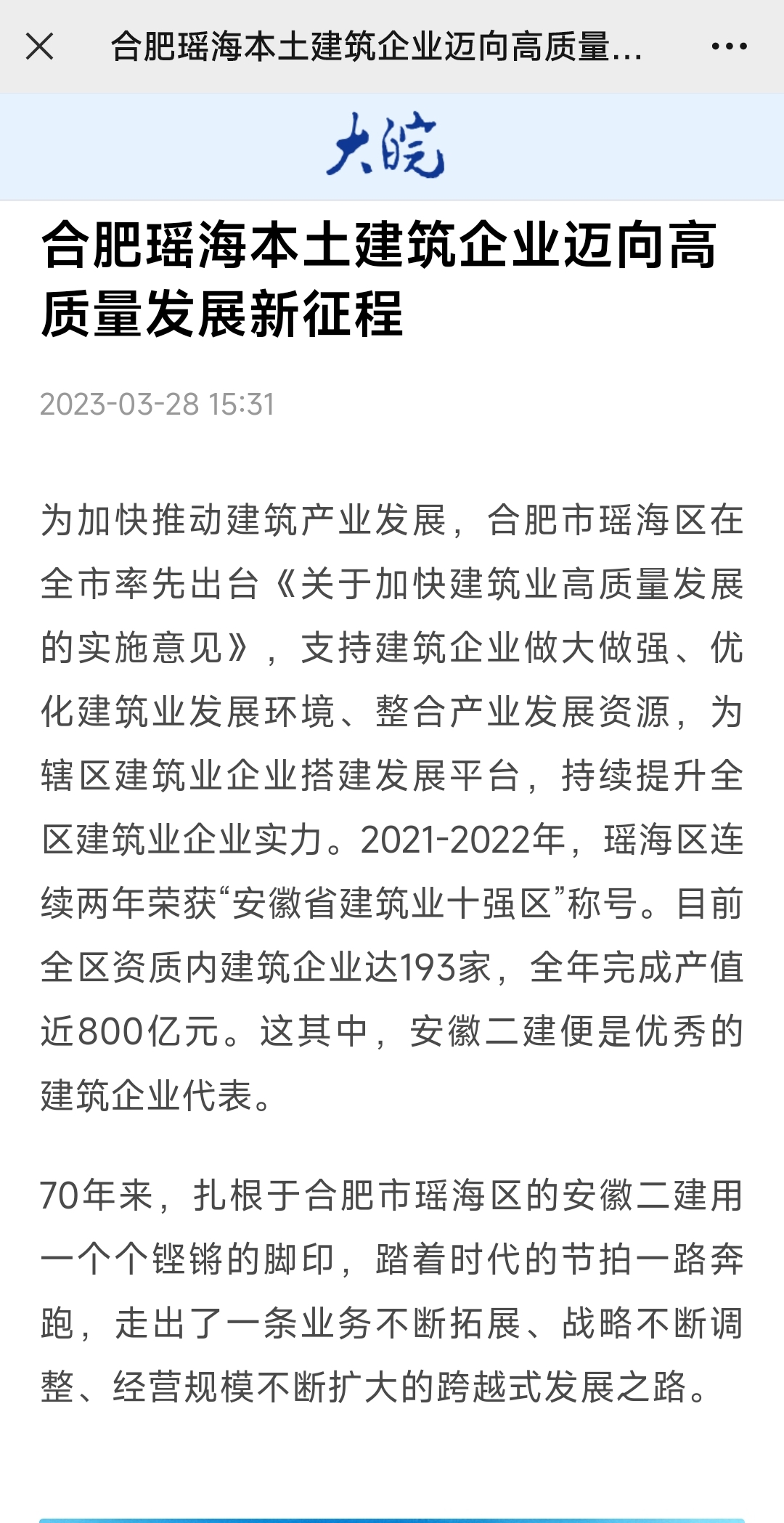 媒體再聚焦丨人民網、中國網、中國日報網、安徽日報、大皖新聞、瑤海發布等主流媒體聚焦報道安徽二建公司砥礪奮進七十載,邁向高質量發展新征程