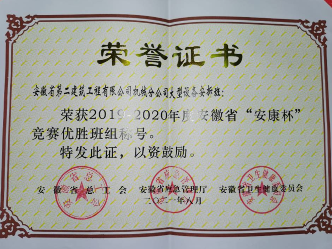 安徽二建公司機械分公司大型設備安拆班是一支負有戰斗力的班組,擔負全公司大型設備安拆維保任務。安拆班現有職工18人,包含4名黨員,4名入黨積極分子,主要負責大型設備的安拆、加節、維修保養及施工現場外電防護安裝作業等工作。多年來,安拆班始終堅持安全生產理念,開展以“安全生產月”“安康杯”為重點的競賽活動。從細節入手,樹立零違章理念,堅持教育和懲罰相結合,落實責任、夯實基礎,避免不安全事件的發生。通過強化管理較好的完成各項指標,班組曾多次獲得建工集團、公司“先進集體”等多項榮譽稱號,2019年,分公司被合肥市建筑工程協會評為“2018年度起重設備安全管理先進企業”,次年,又被合肥市建筑工程協會評為“2019年度合肥市建筑業優秀起重設備安裝工程專業承包企業”。2020年,分公司大型設備安拆班榮獲2019-2020年度安徽省“安康杯”競賽優勝班組稱號,這份榮譽屬于公司,也屬于每一個奮勇投身特種設備安全的一線作業人員。