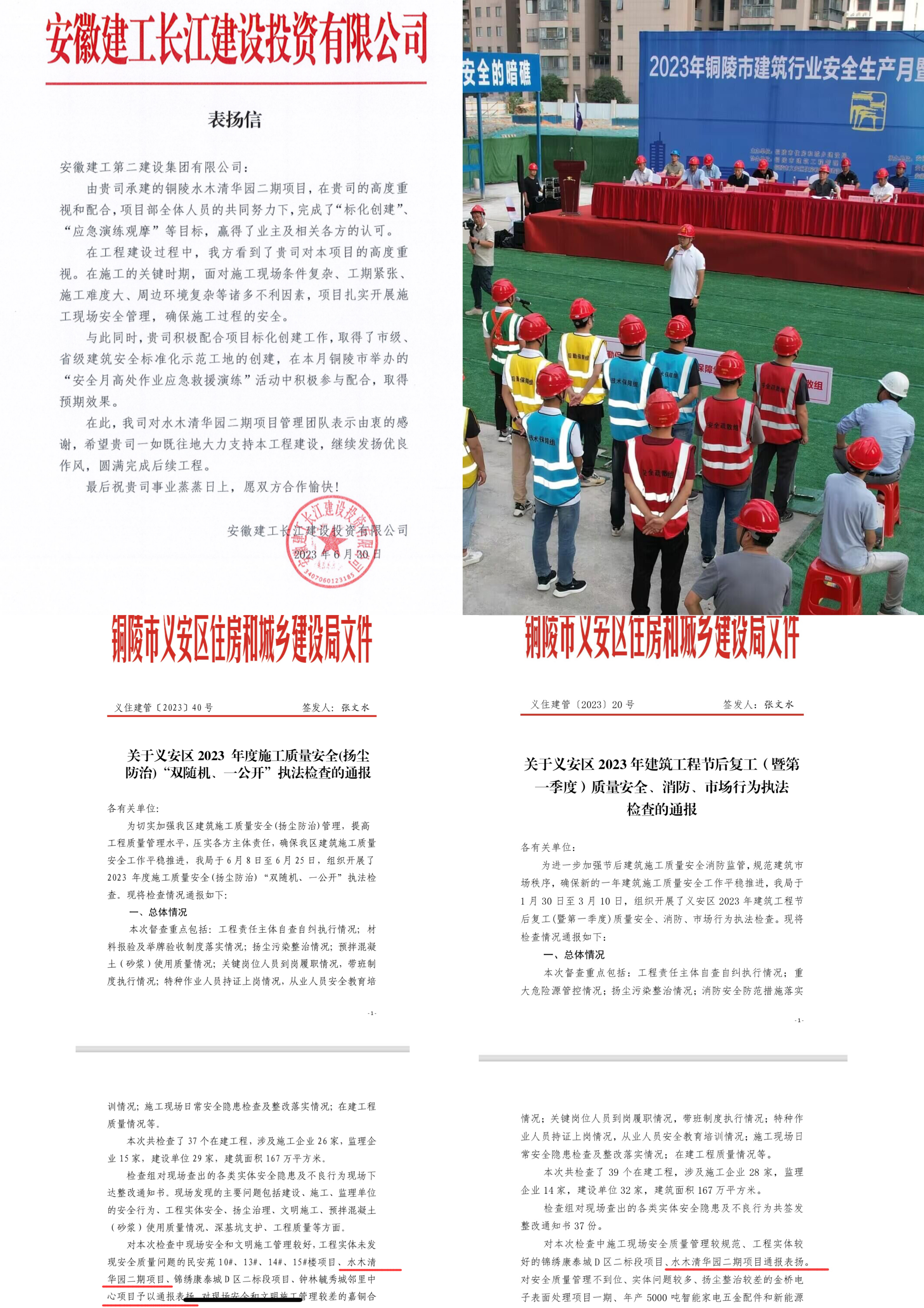 項目自開工以來先后創建了安徽省及銅陵市“建筑安全生產標準化示范工地”、集團和公司兩級“黨員先鋒號”“工人先鋒號”“青年文明號”工程。項目部在義安區住建局2023年一季度、二季度檢查中被連續通報表揚,并順利承辦了2023年銅陵市建筑行業安全生產月暨高處作業應急救援演練活動,受到屬地主管部門的一致好評。
