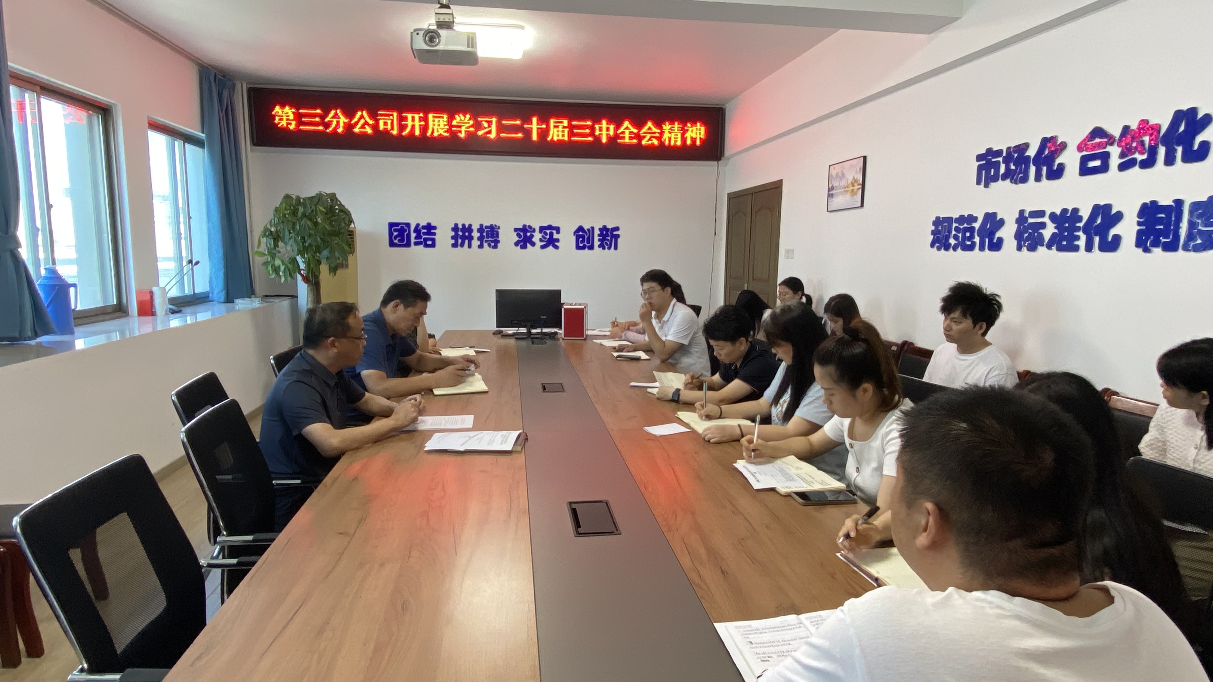 第三分公司黨支部組織召開學習黨的二十屆三中全會精神專題會,深入學習了黨的二十屆三中全會公報內容,從全會的重大意義和重要成果,進一步全面深化改革的主題、重要性和必要性以及重大原則、重大舉措,貫徹落實全會精神的基本要求等方面進行了全面解讀。通過深入淺出的講解,使全體干部職工對全會精神有了更加全面、深刻的理解,進一步增強了貫徹落實的自覺性和堅定性。