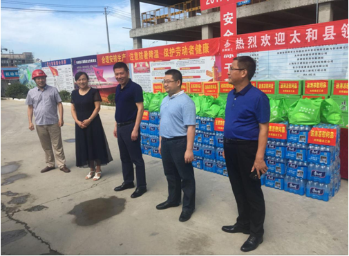 連日來高溫酷暑,為有效緩解高溫給一線施工人員帶來的不便,更好地維護施工現場員工身心健康和人身安全,確保工程進度有力推進,7月19日上午,太和縣縣長劉牧愚、重點局局長苗玉勇一行頂著烈日來到安徽二建太和發藝時尚文化中心施工現場開展“送清涼”活動,給奮戰在一線的廣大員工送去了絲絲涼意和誠摯的關懷。
